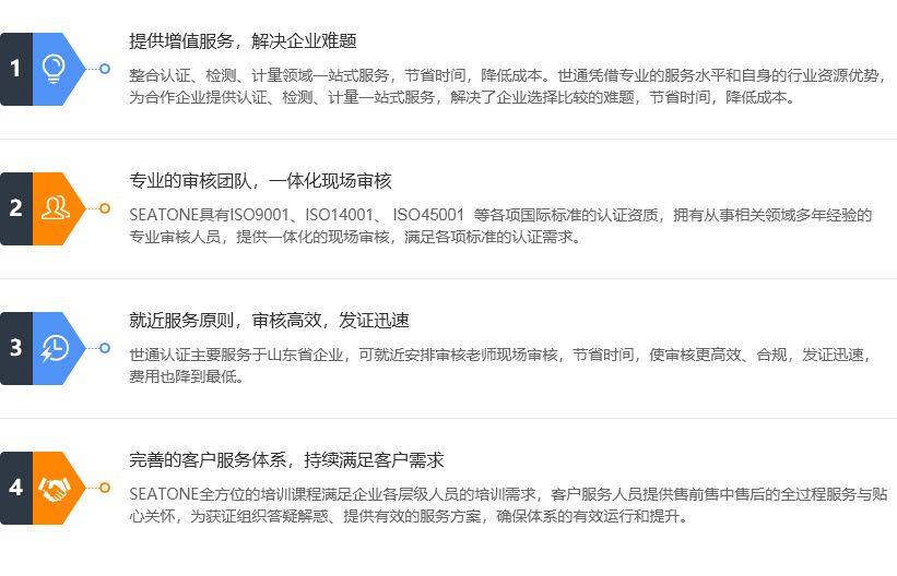 世通業務范圍:ISO9001、ISO14001、ISO45001、ISO22000、ISO50001,誠信管理體系、服務認證、GB/T50430、HACCP、信息安全(ISO27000、ISO20000)、軍工資質(軍工四證、涉密資質)、海關AEO認證,培訓等服務,世通認證可針對企業管理 的各個層面進行規范、完善和提高,以滿足不同客戶的管理和培訓需求,致力于提供最佳的問題解決方案,以幫 助企業搭建一個能真正實現持續改進的管理平臺,同時塑造一支觀念超前,高效合作的管理團隊。