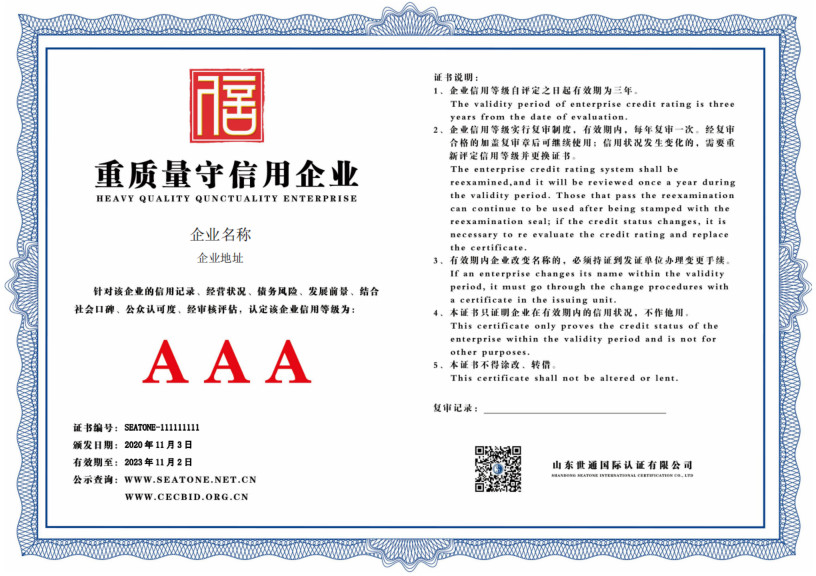通過世通AAA信用評級,你可獲得:企業資信等級證書、質量服務誠信單位、重合同守信用企業信用、誠信經營示范單位、重質量守信用單位、重服務守信用企業、企業信用等級報告、銅牌、信用報告等。