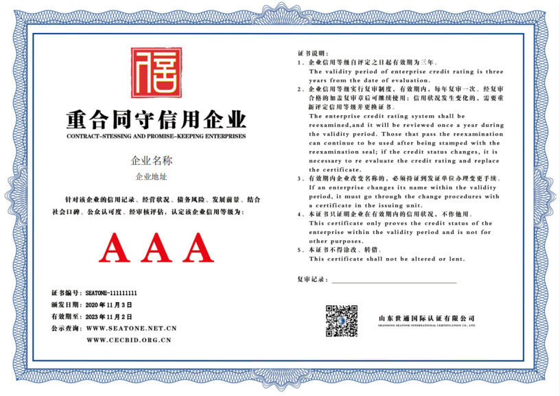通過世通AAA信用評級,你可獲得:企業資信等級證書、質量服務誠信單位、重合同守信用企業信用、誠信經營示范單位、重質量守信用單位、重服務守信用企業、企業信用等級報告、銅牌、信用報告等。