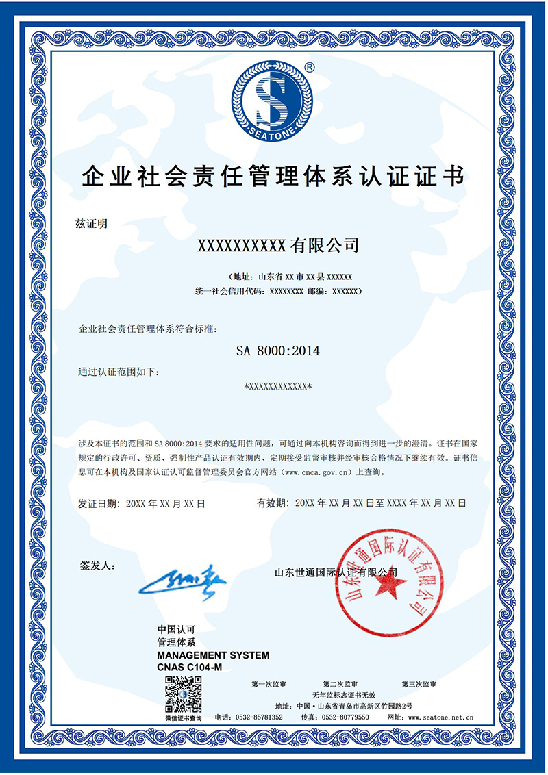14、頒發(fā)認(rèn)證證書。認(rèn)證機(jī)構(gòu)向經(jīng)批準(zhǔn)注冊的公司頒發(fā)SA8000認(rèn)證證書。