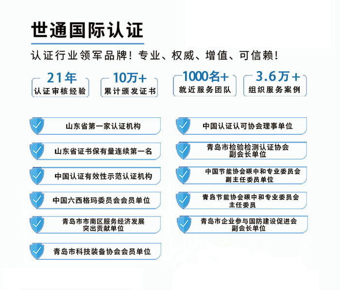 世通國(guó)際認(rèn)證是中國(guó)節(jié)能協(xié)會(huì)碳中和專業(yè)委員會(huì)副主任單位、青島市節(jié)能協(xié)會(huì)碳中和委員會(huì)主任委員,作為經(jīng)國(guó)家認(rèn)監(jiān)委備案批準(zhǔn)的在碳中和領(lǐng)域可以頒發(fā)證書(shū)的權(quán)威機(jī)構(gòu)、CCAA溫室氣體核查員注冊(cè)推薦機(jī)構(gòu),有能力為各類組織在節(jié)能碳中和方面提供一站式服務(wù),證書(shū)權(quán)威有效廣泛認(rèn)可。