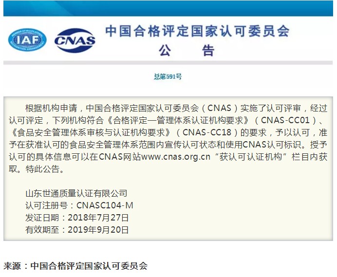 近日,山東世通質(zhì)量認(rèn)證有限公司正式取得CNAS食品安全管理體系認(rèn)可證書,標(biāo)志著世通具備了頒發(fā)食品安全管理體系帶CNAS認(rèn)可標(biāo)識(shí)證書的資質(zhì)和能力。