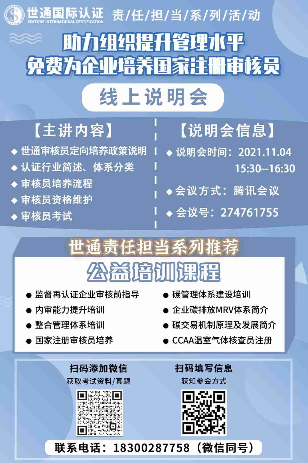 為更好履行社會責任,回饋社會、回饋客戶,踐行“為客戶創(chuàng)造價值,幫助客戶成長”的世通使命, 世通認證推出“國家注冊審核員免費定向培養(yǎng)”行動。
