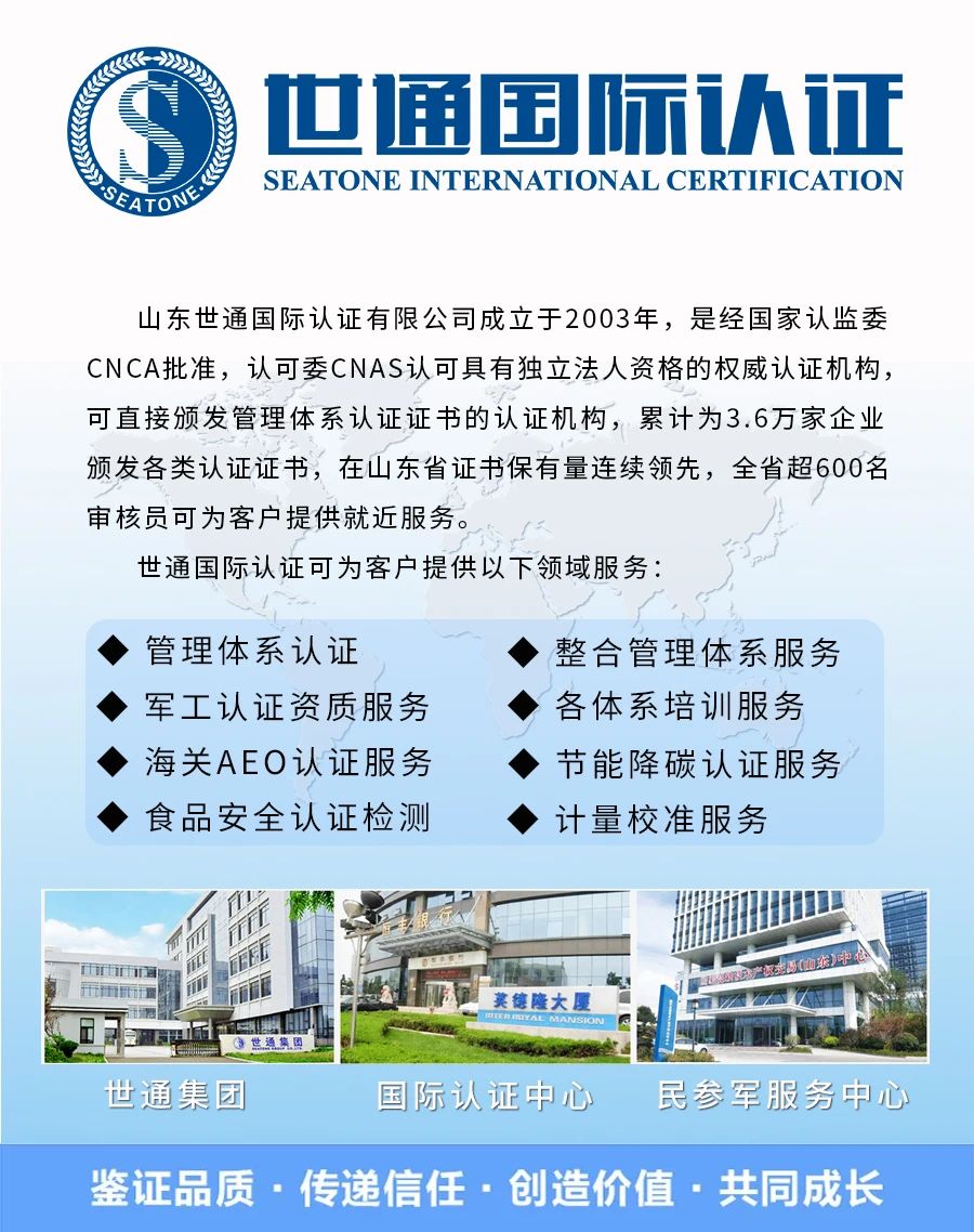 山東世通國際認證有限公司成立于2003年,是經(jīng)國家認監(jiān)委(CNCA)批準、認可委(CNAS)認可、具有獨立法人資格的可直接頒發(fā)證書的認證機構(gòu)。19年、累計為3.6萬家企業(yè)頒發(fā)超過10萬+各類認證證書,在山東省證書保有量第一。
