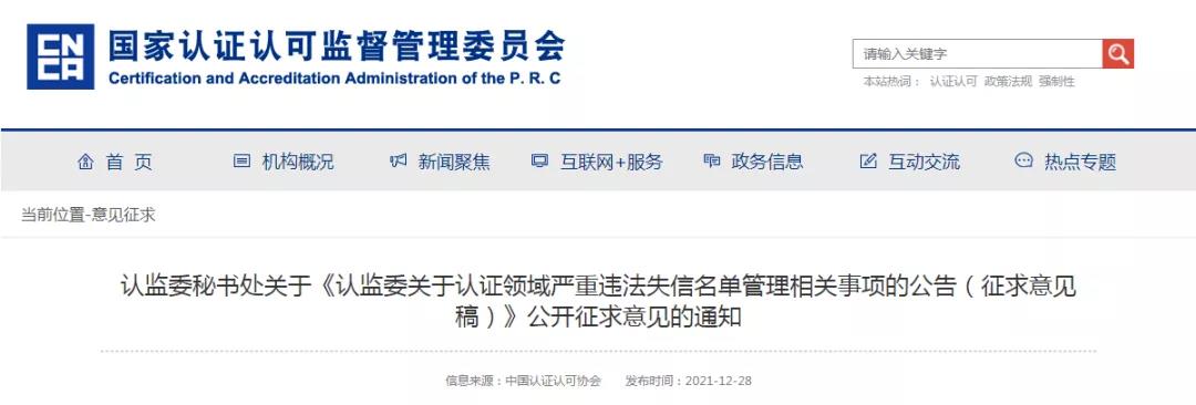 認監委秘書處關于《認監委關于認證領域嚴重違法失信名單管理相關事項的公告(征求意見稿)》公開征求意見的通知