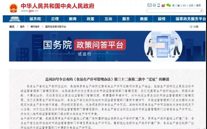 食品生產者的生產場所遷址的,是指將原有生產場所遷離食品生產許可證載明的原生產地址,包括生產場所遷出原發證的市場監督管理部門管轄范圍的,也包括雖然未遷出原發證的市場監督管理部門管轄范圍,但已遷離原生產場所地址的。