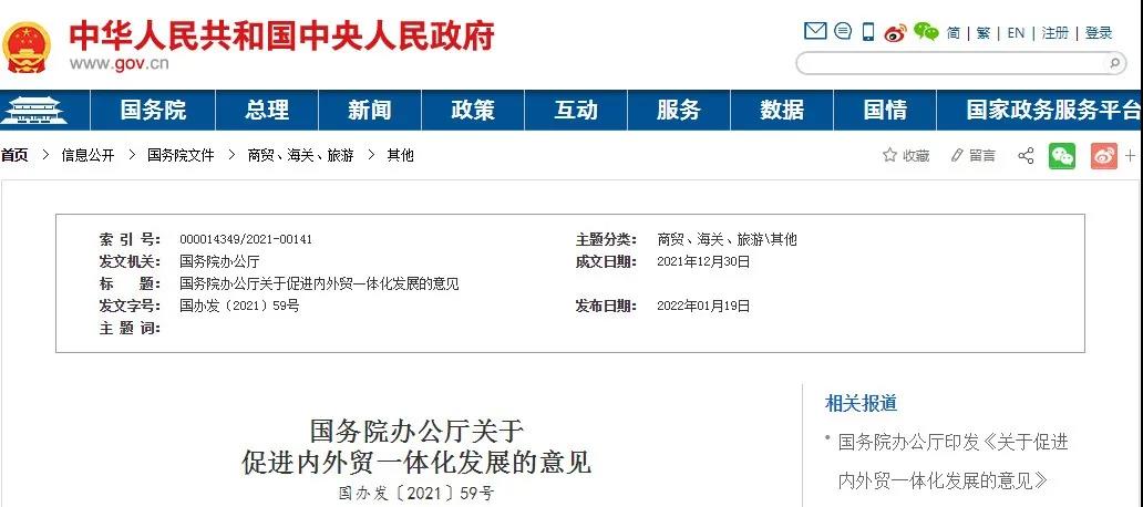 國(guó)務(wù)院辦公廳關(guān)于促進(jìn)內(nèi)外貿(mào)一體化發(fā)展的意見(jiàn)