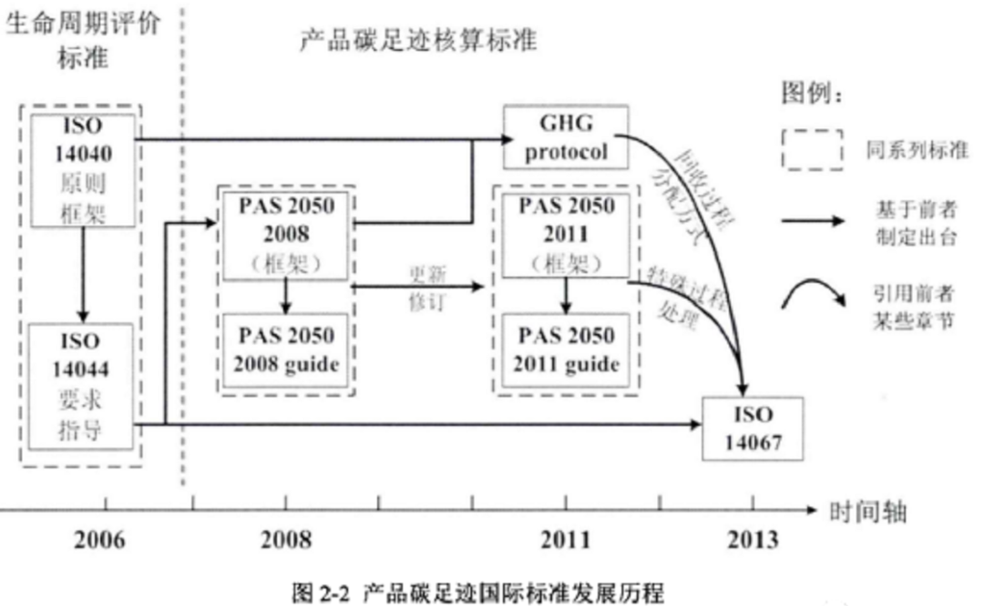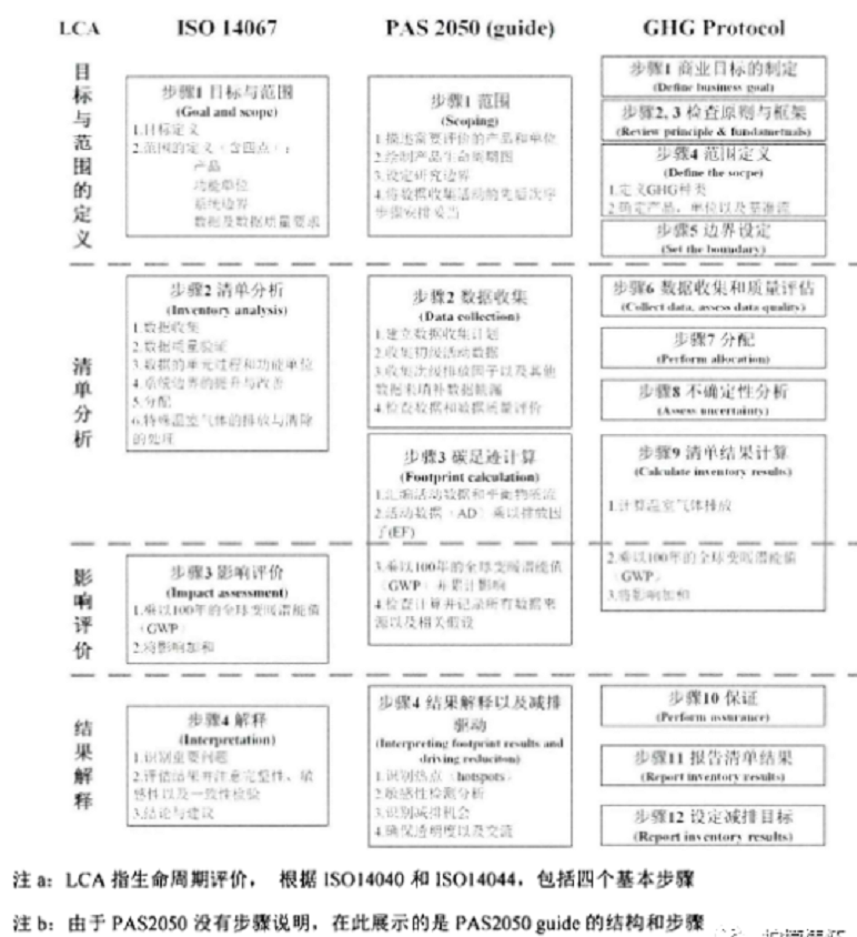 (1)概念層面,該標準建立在ISO14040和ISO14044的生命周期評價的基本步驟和框架基礎上,省略了部分生命周期影響評價(LCIA)的內容,同時添加了處理碳排放的特殊過程的相關指導,增強標準的針對性和目的性。