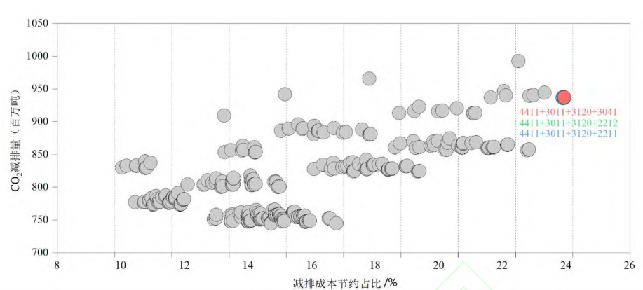 上圖展示了全國碳市場一次性納入1~3個計劃內行業的全部行業組合模擬結果,減排成本節約占比最高的行業組合即為最優納入組合順序。