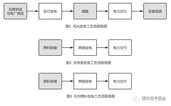 首先看風(fēng)光發(fā)電、生物質(zhì)發(fā)電和化石能源發(fā)電的生產(chǎn)工藝流程及區(qū)別,分別見(jiàn)圖1、圖2、圖3。