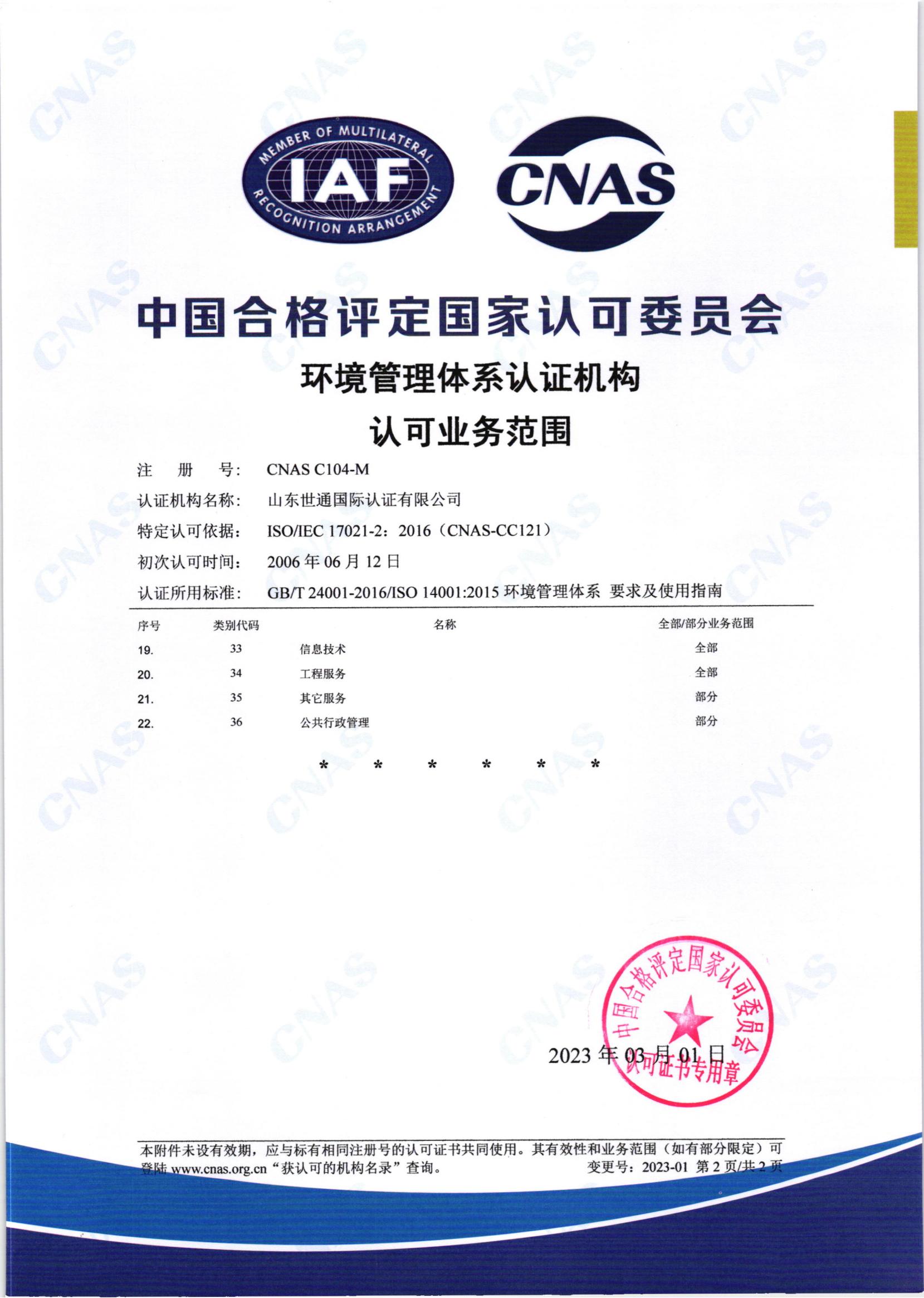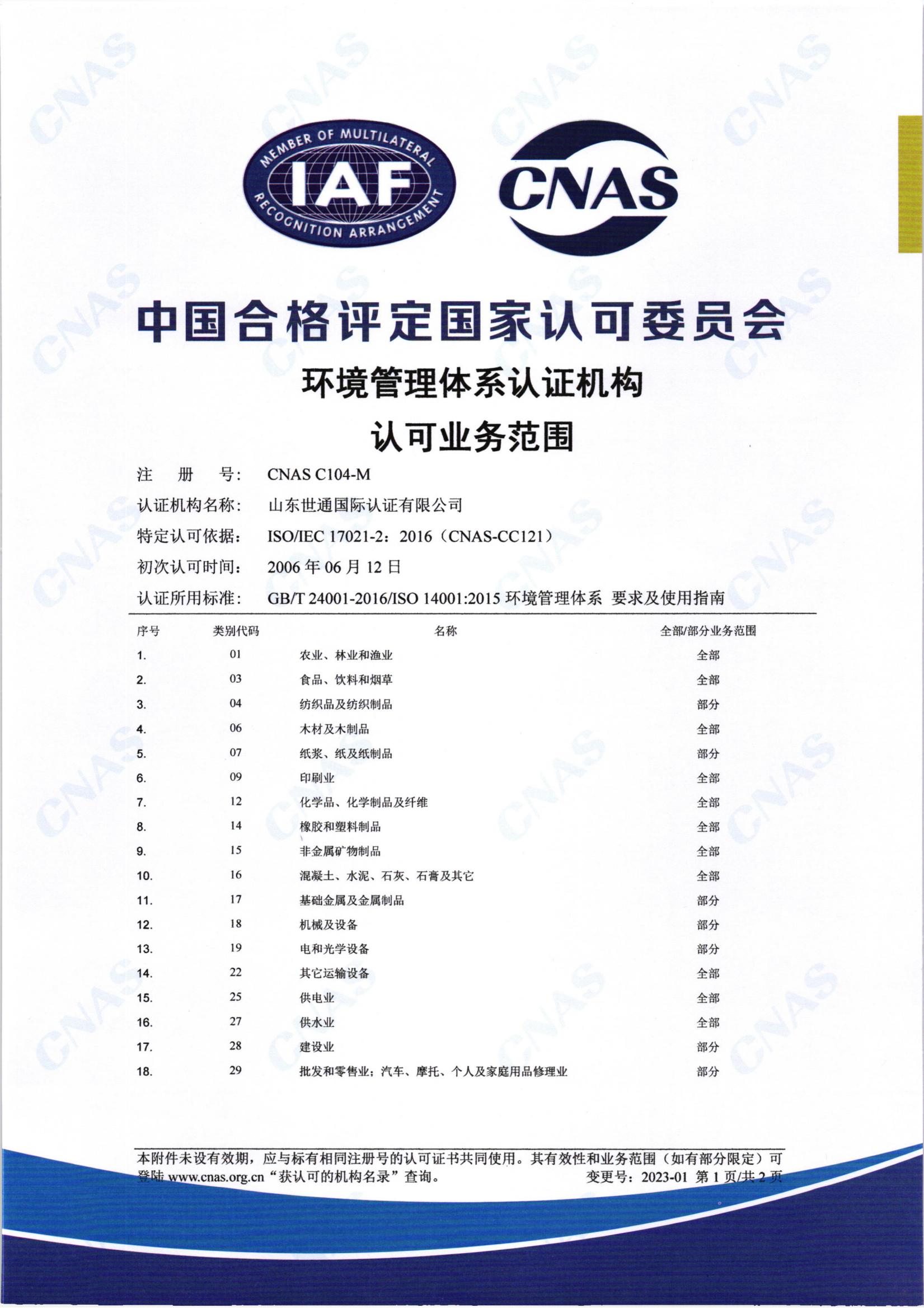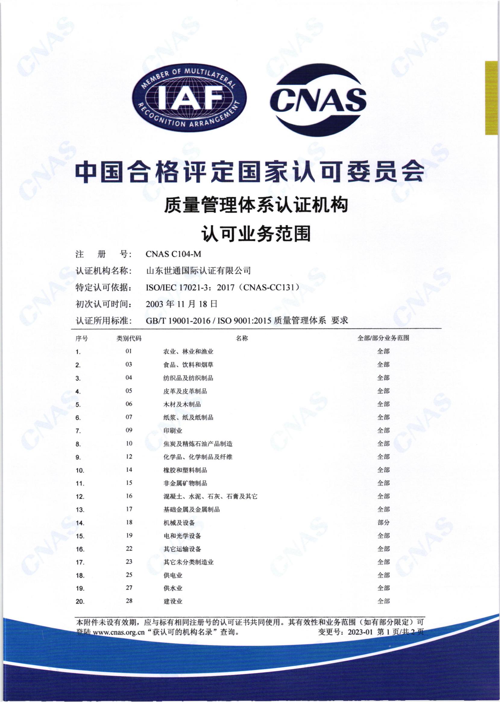 近日,山東世通國際認證有限公司質量、環境、職業健康安全管理體系34大類業務范圍及環境、職業健康安全管理體系09大類業務范圍通過中國合格評定認可委員會(CNAS)認可。