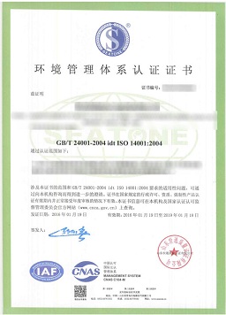 環(huán)境管理體系證書樣本