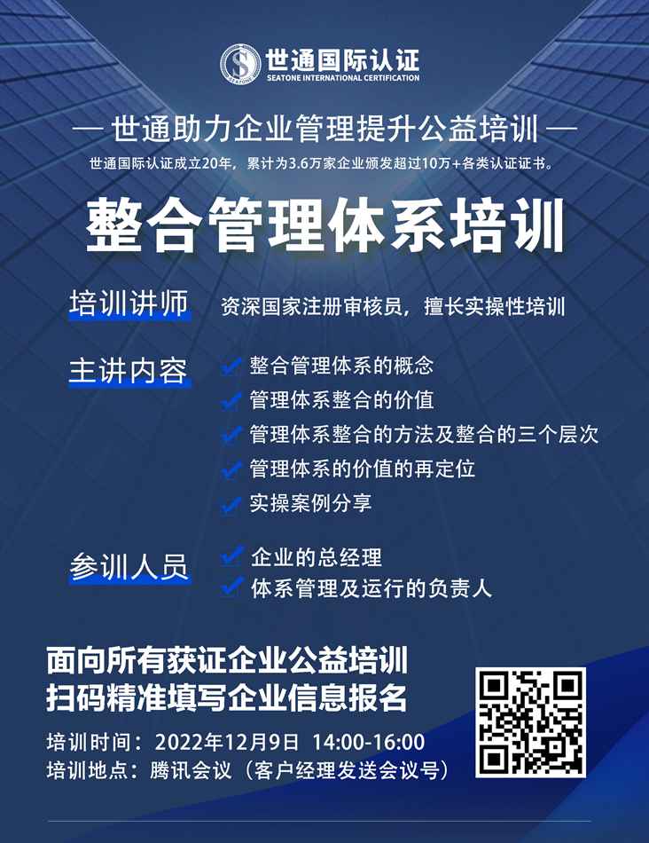 下一篇:【公益培訓】世通助力企業(yè)管理提升—《監(jiān)督、再認證企業(yè)審核前指導》12月公益課堂
