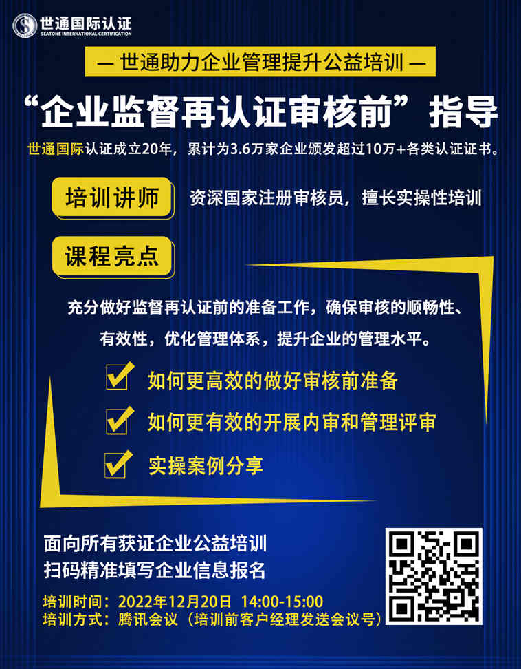 下一篇:【公益培訓】世通助力企業管理提升—《監督、再認證企業審核前指導》1月公益課堂