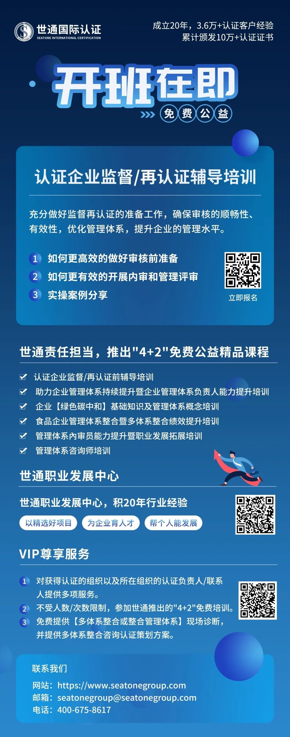 世通認證責任擔當,現(xiàn)推出"4+2"免費公益精品課程,充分做好監(jiān)督再認證的準備工作,確保審核的順暢性、有效性,優(yōu)化管理體系,提升企業(yè)的管理水平。